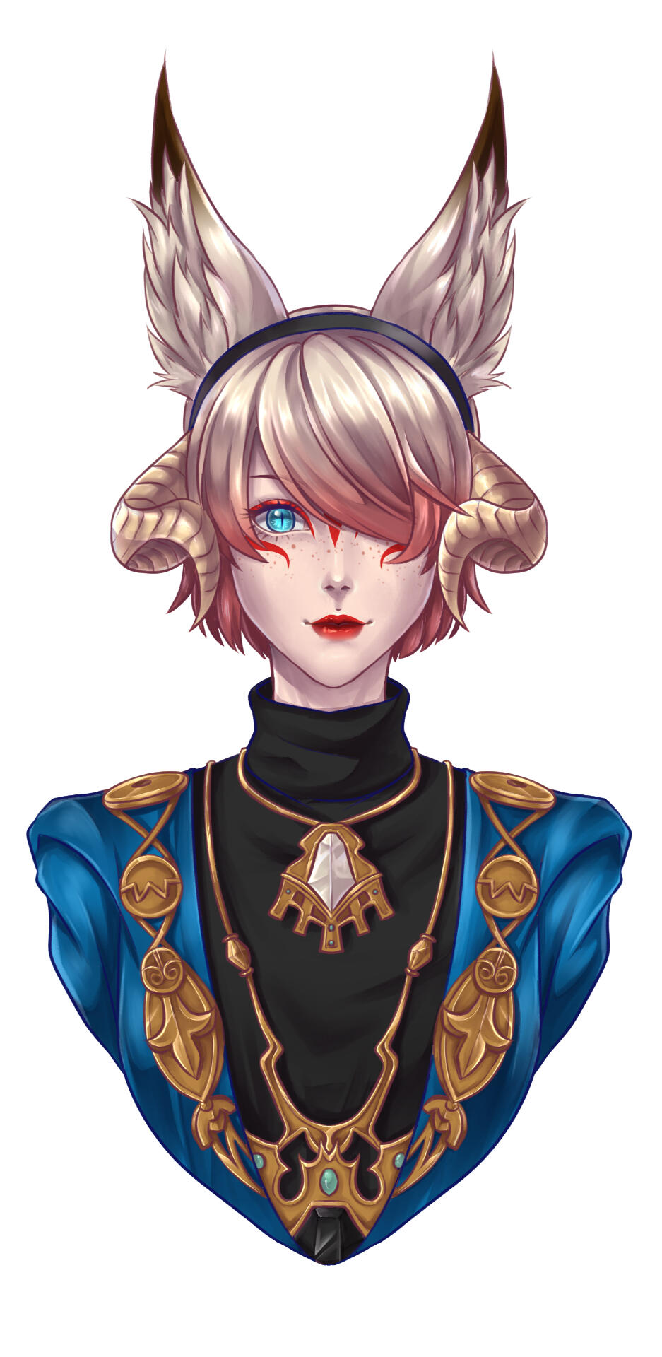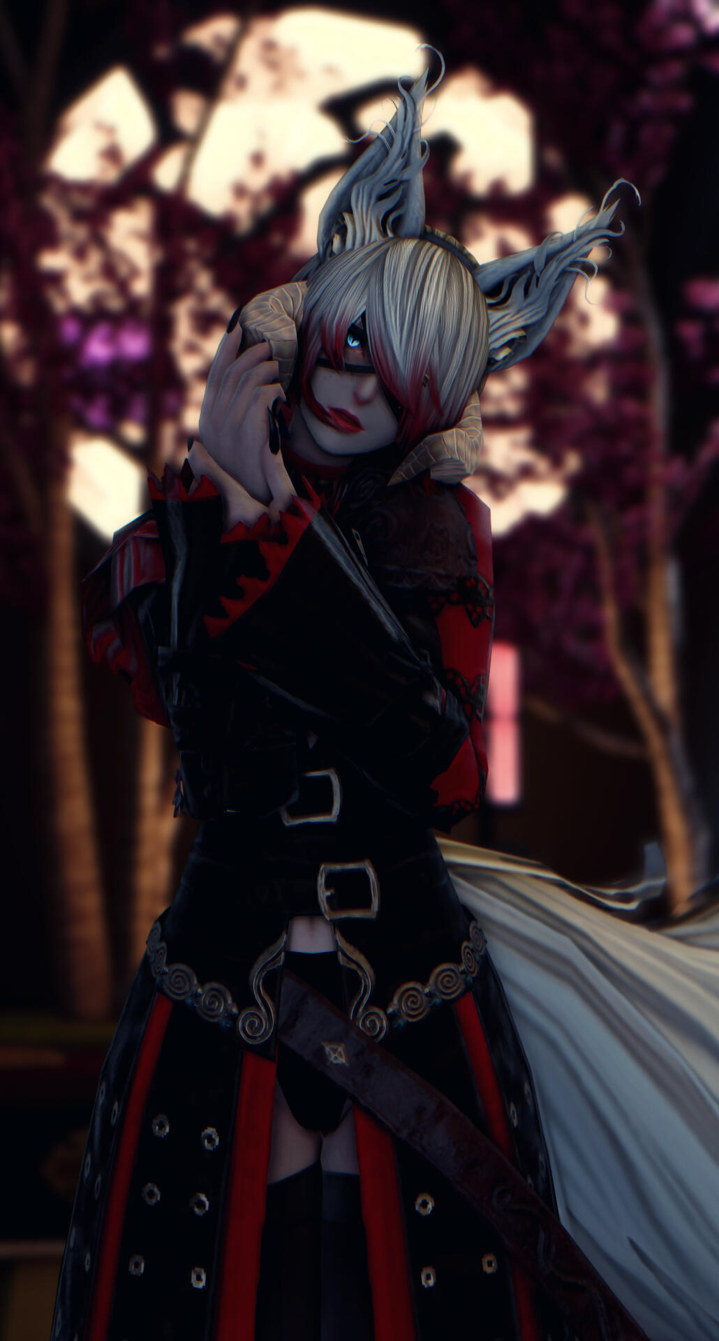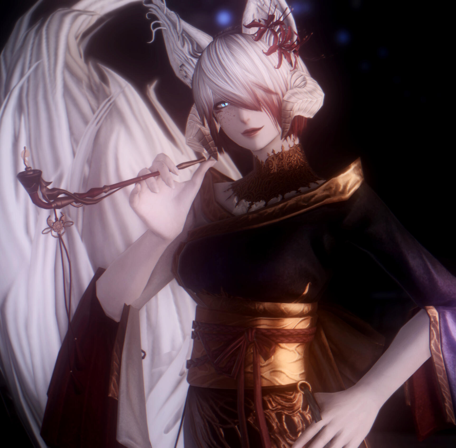 She has two versions of herself, the first is of a dainty Raen with short cropped snowy hair with the bangs styled over one eye. The second form is more akin to her true form, looking very reminiscent of a scaled and short statured miqo'te with long raven black hair. Both forms sport tall fluffy ears and nine tails of vulpine form. These translate into her male form as well.