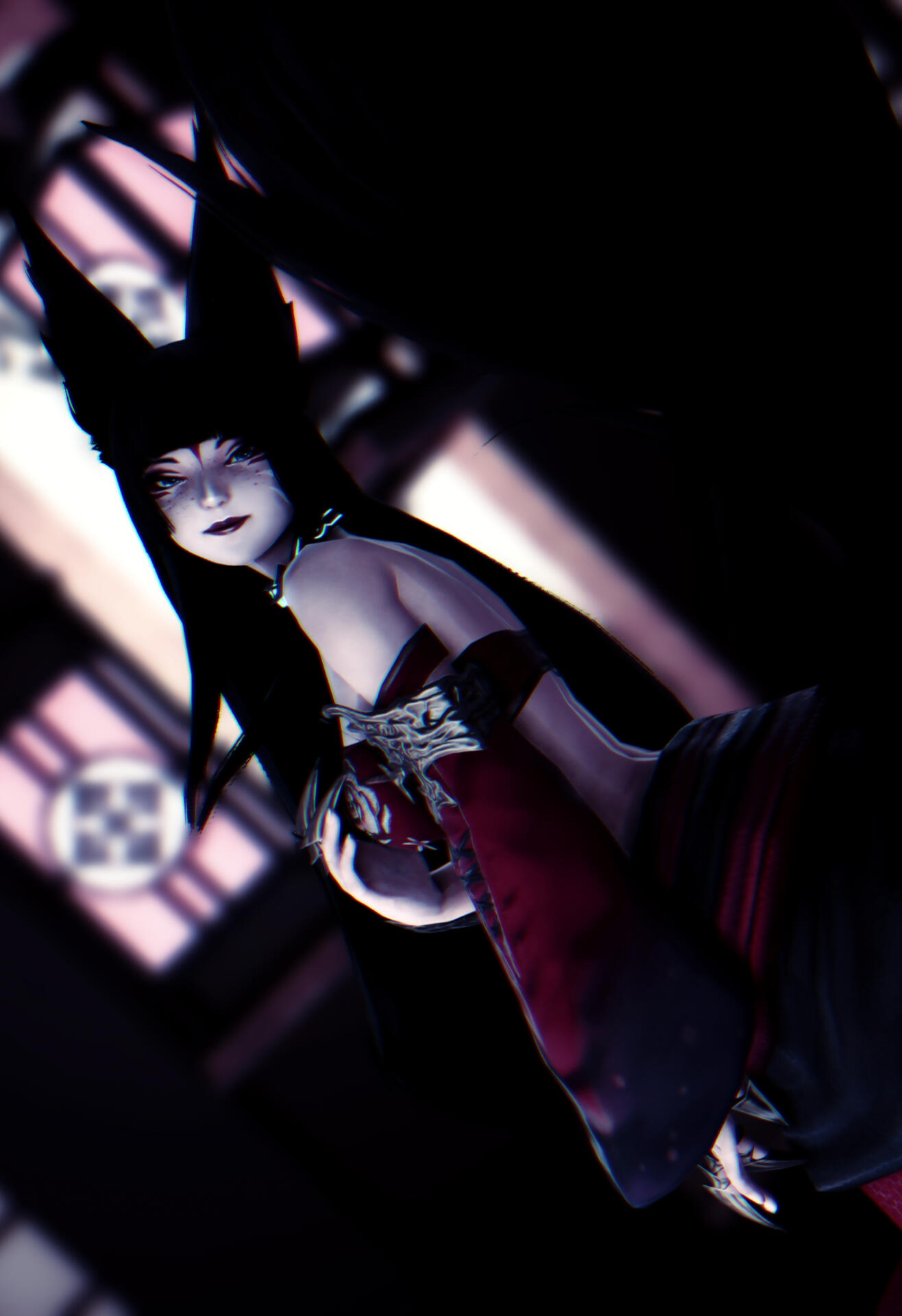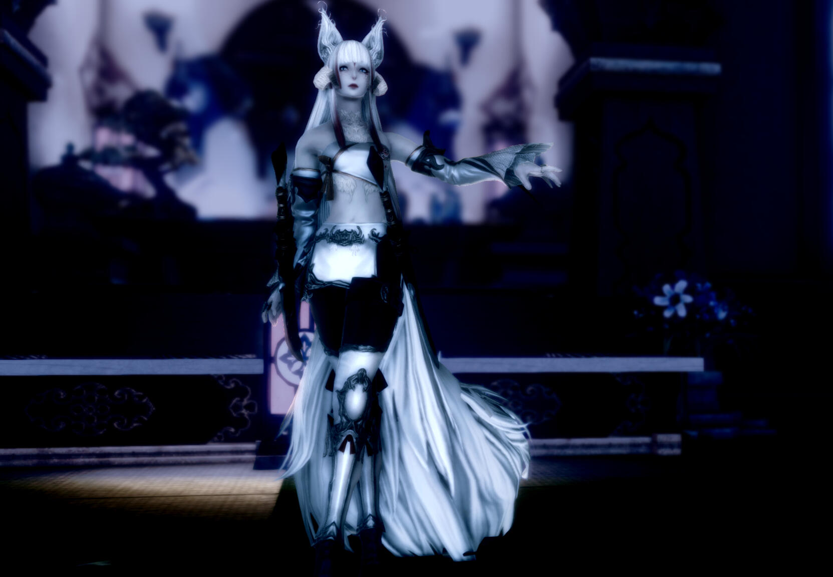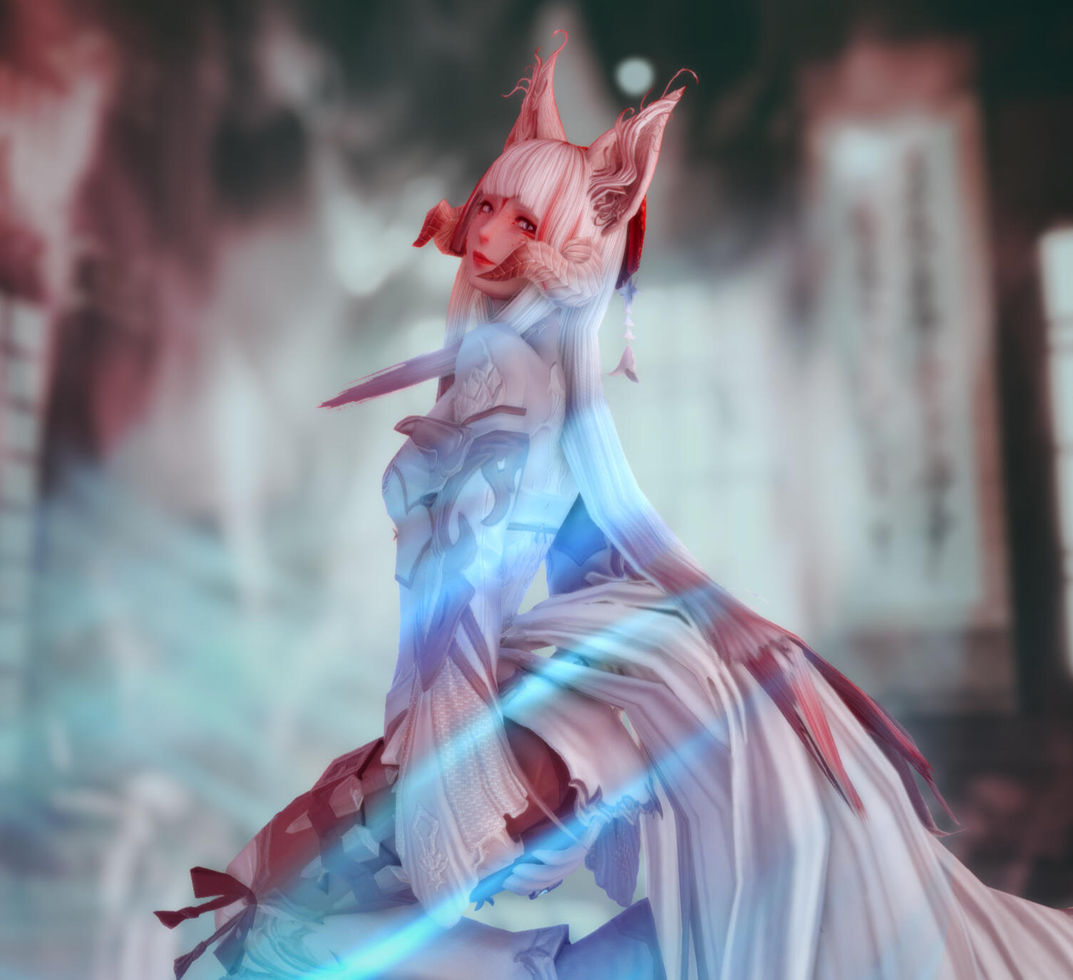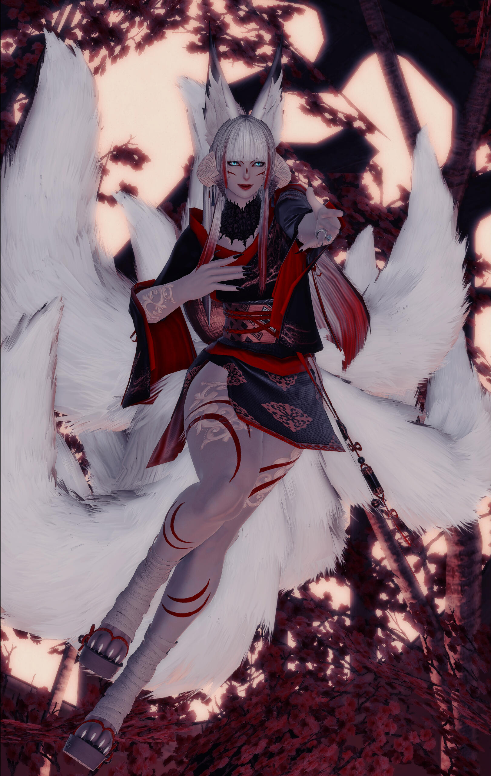 At first glance, it is very obvious that she isn't just a plain Raen woman. Her eyes glow faintly and reflect the light like some kind of demon, the pupils slitted. There would also be the occasional sight of two longer than normal eyeteeth/canines, one could mistake her as being half miqo'te. But that isn't the truth, there is an unnatural and ethereal beauty to her appearance and in the graceful way she holds herself, two fluffy fox tails as long as she is tall along with a pair of tall snowy vulpine ears doing nothing but accentuating it. To top it all off, she has a pair of digitigrade fox paws as feet. A curious creature indeed.