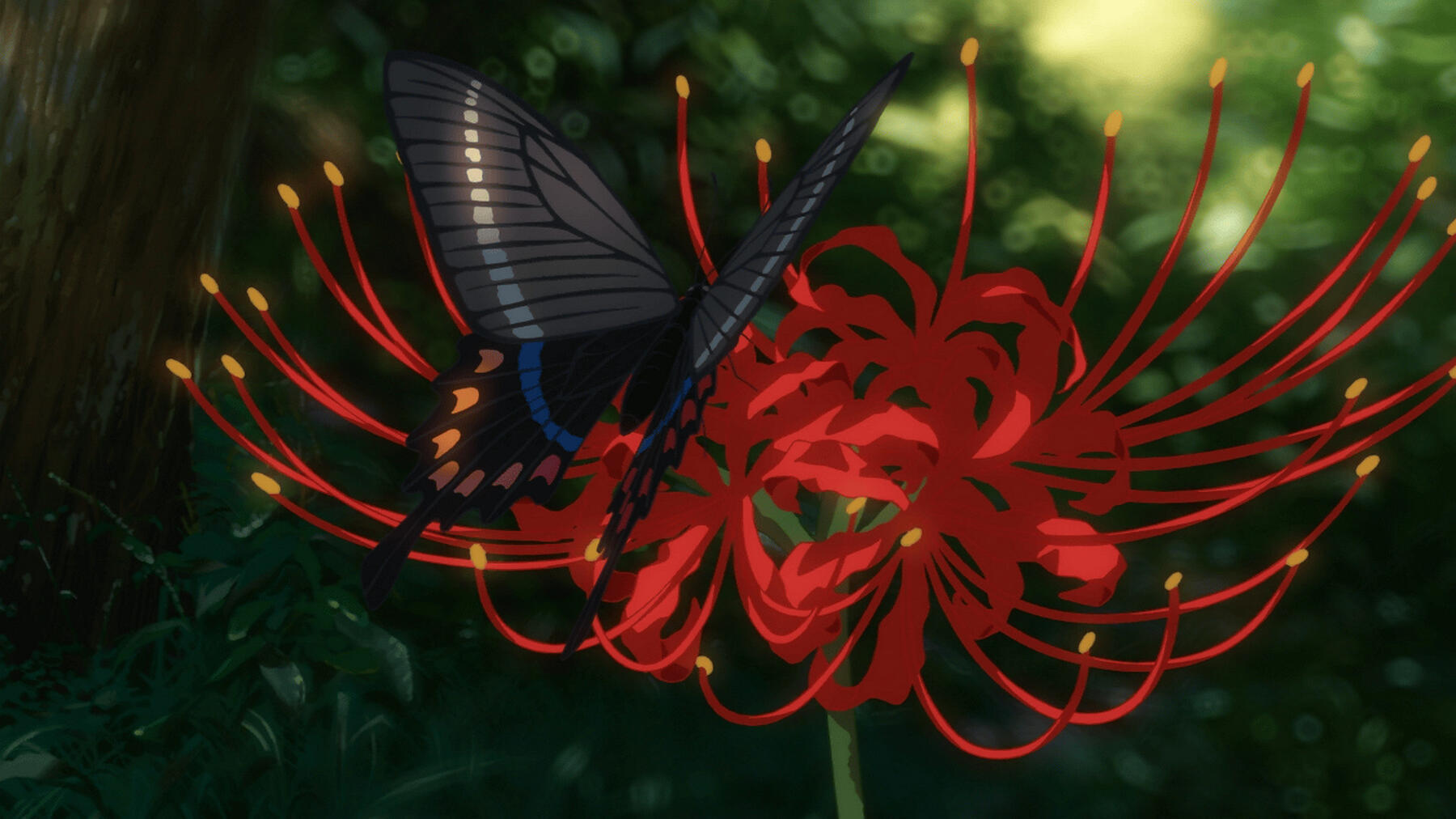 Always has red spiderlilies adorning her hair and even clothing in the form of patterns/embroidery.
