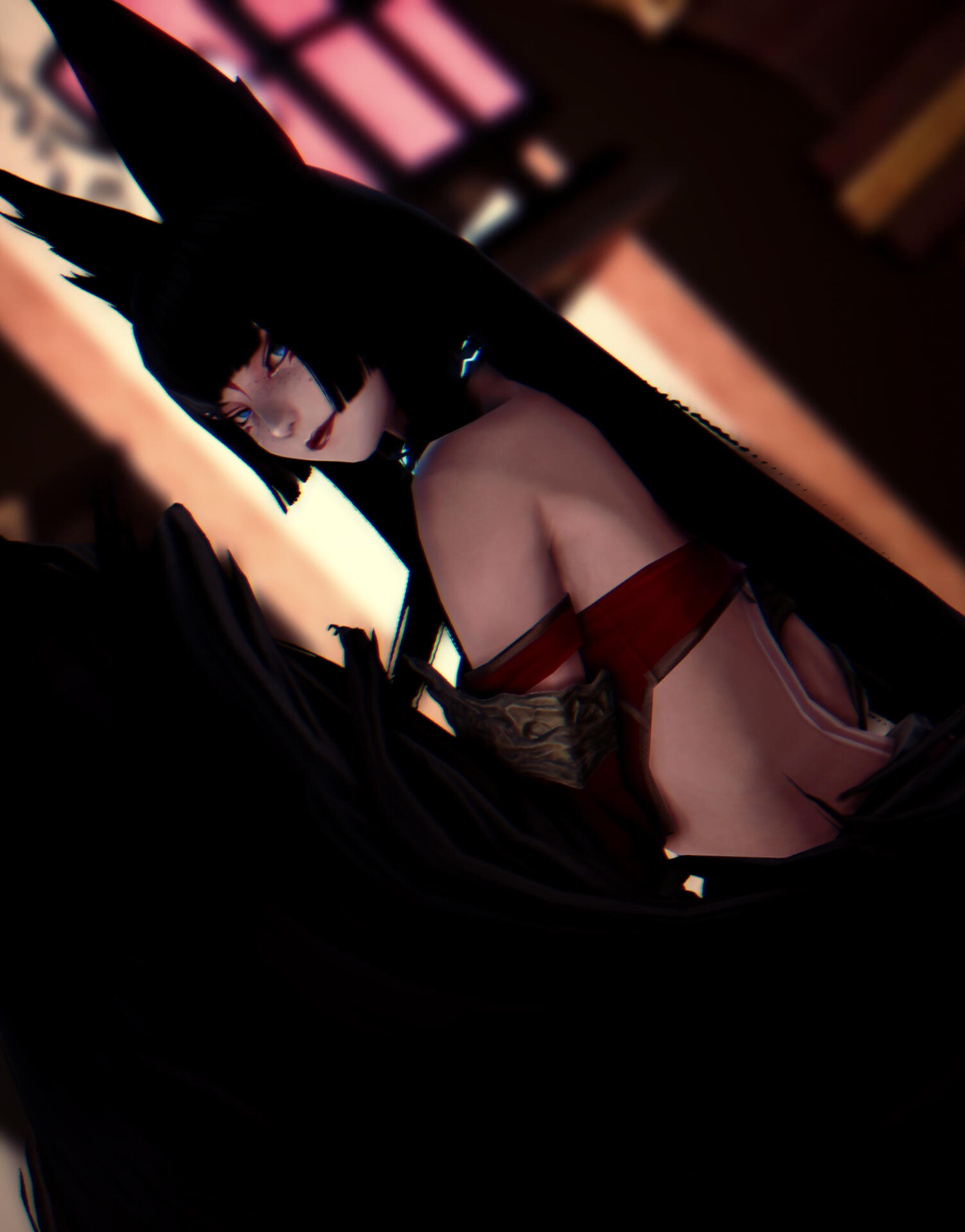 'Limiter collar' and 'control cuffs'- A band of metal as black as the night is worn around the slender neck of the vixen at all times, blueish or reddish detailing wrapping and snaking around and through the metal which seems to carry a soft ethereal pulsating glow as it it were tied to her very life essence itself. It's function is to keep the fox stuck in her 'humanoid' form, restricting her from shifting into her true beastial self for the safety of herself and those around her. Who managed to place this on her neck and live to tell the day, she will not say.
